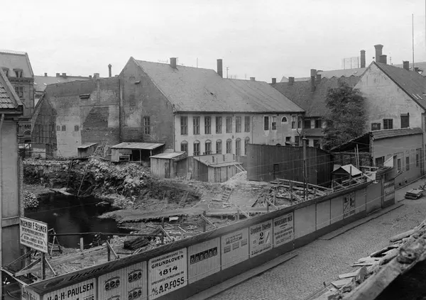 Dronningens gate 15, Oslo. Det gamle Kirkedepartement. Sett fra Tollbugt. Rivningstomt.