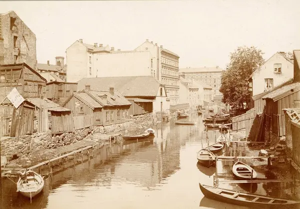 Bebyggelse og båter langs Akerselva, Oslo. Antagelig fra Vaterlandsbru.