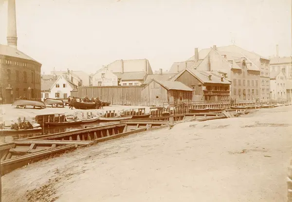 Bebyggelse og båter langs Akerselva, Oslo. Muligens nedenfor Vaterlandsbru.