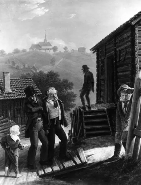 Oslo. Oljemaleri av J. Flintoe. Genrebilde med mennesker, hus og Gamle Aker kirke i bakgrunnen.