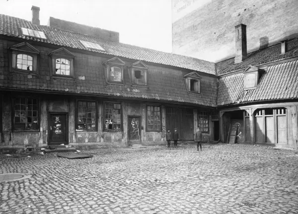 Rådhusgata 13, Oslo. Stiftsgården. Tre mennesker i et brosteinslagt gårdsrom.