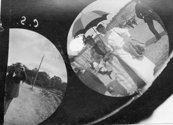 To kvinner med hatter og parasoll, Oslo. Til høyre frk. Margarethe Dedekam, gift Fürst. Til venstre mann med hatt, overlærer Wallem.