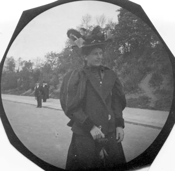 Frk.Fanny Nordraak spaserer nedover Karl Johans gate, Oslo, med Slottsparken i bakgrunnen.