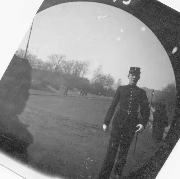 Ung mann i uniform foran Slottet, Oslo. Jacob Sommerfeldt, student 1892.