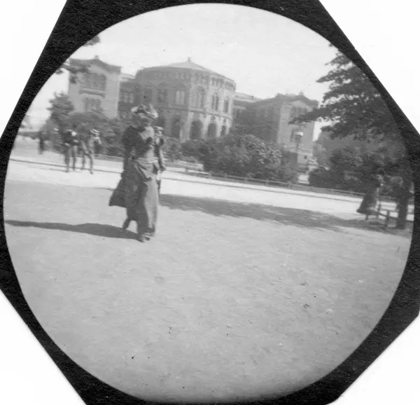 Frk.Lilla Heiberg spaserer langs Studenterlunden, Oslo med Stortinget i bakgrunnen.