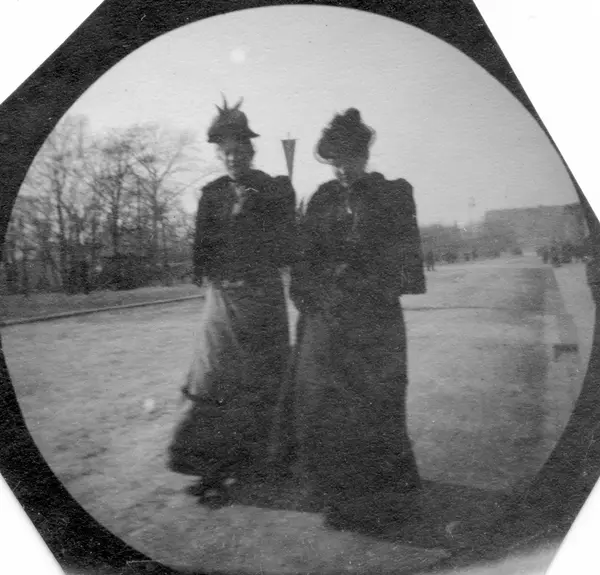 To damer spaserer på Karl Johans gate, Oslo, med ryggen til Slottet. Fra venstre: Ingeborg Dybwad, gift Lind, og Magnella Arentz.