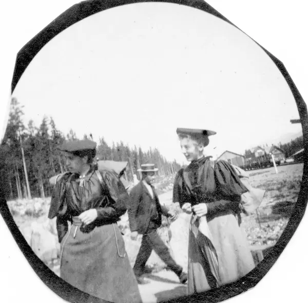 To damer med turutstyr ved Tretten stasjon, Øyer, Oppland. Frk. Bjørnson og frk. Sørensen.
