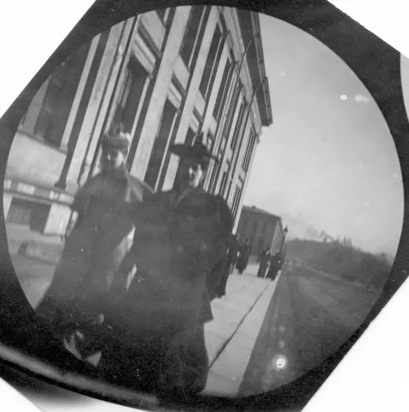 Frk. Julie Nielsen og Ragnhild Horn spaserer langs Universitetet, Oslo.
