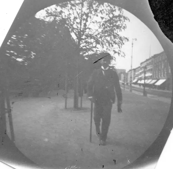 Mann spaserer langs Karl Johans gate, Oslo. Muligens konsul Coates.