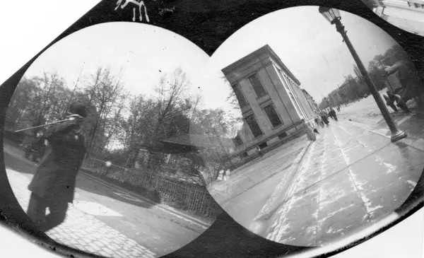 Bildet til venstre, professor C. M. Guldberg spaserer i villastrøk. Bildet til høyre er fra Universitetsplassen og Karl Johans gate, Oslo.