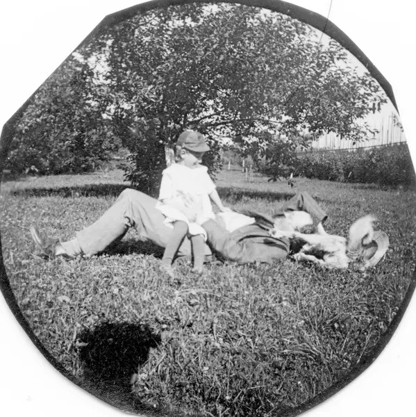 Dr. Elling Holst ligger i gresset med datteren Aagot på fanget, hund liggende ved siden av.
