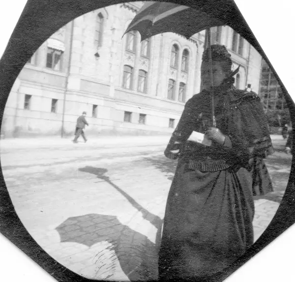 Fotografens mor, fru apoteker Størmer, spaserer på Wessels plass, Oslo med Stortinget på andre siden av gaten.