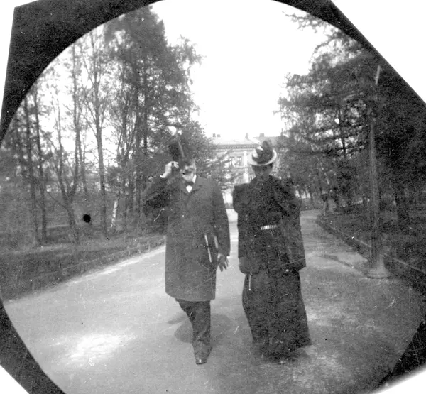 Sekretær Bull med hånden på hatten og datter, frk. Duddu Bull, spaserer i park. Bygårder i bakgrunnen.