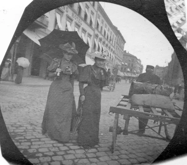 Frk. Lilla Heiberg og frk. Strøm krysser Karl Johan, Oslo. Mann med håndkjerre og hestevogn.