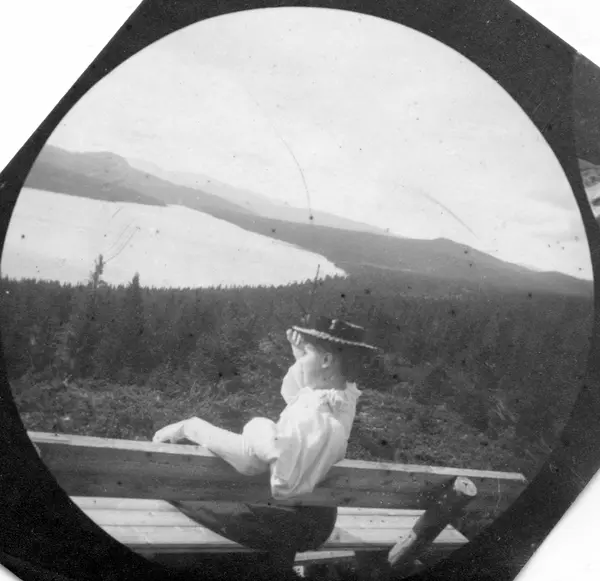 Golå, Sør-Fron, Oppland. Frk. Olga Schiøll sitter på krakk med utsikt over skog og vann.