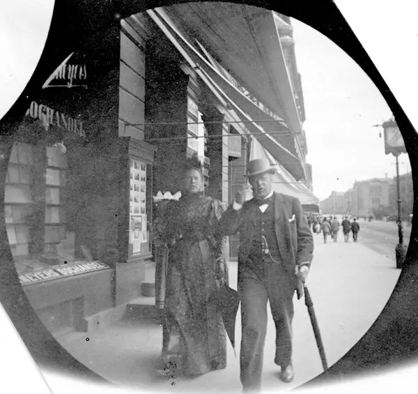 Assessor Reimers og frue spaserer på Karl Johans gate, Oslo, ved bokhandel.