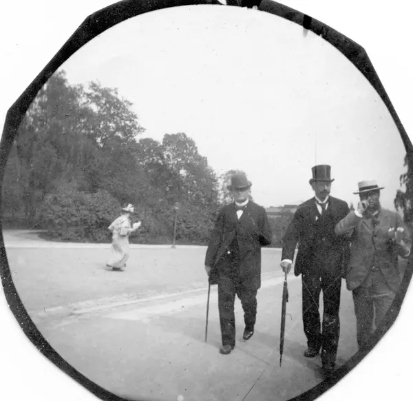 Ottesen, Konow og Lumholtz spaserer i gate ved park, ant. Oslo. Slottsplassen?.