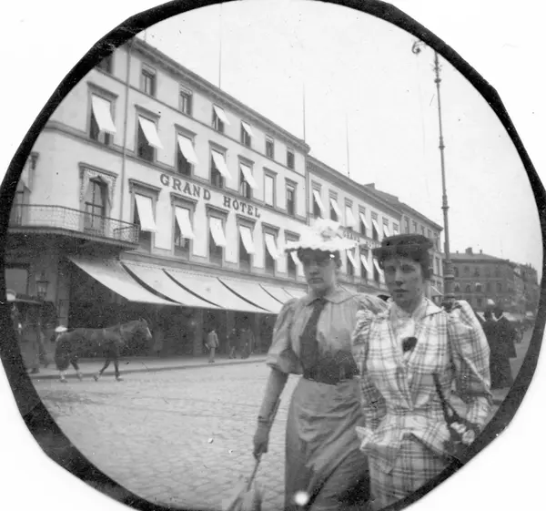 Frk. Just senior og en annen kvinne spaserer langs Karl Johans gate, Oslo, på andre siden for Grand Hotell.