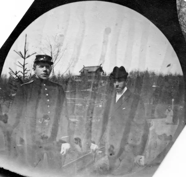 Helge Halvorsen i uniform og Hermann Reimers i skogen. Dragehus på høyde. Studenter fra 1892.