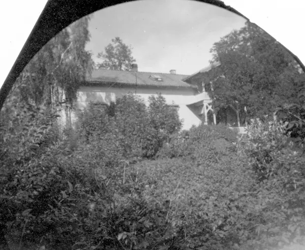 Huset til dr. Elling Holst, Høvik, Bærum. Hvitt hus med stor veranda i hage.