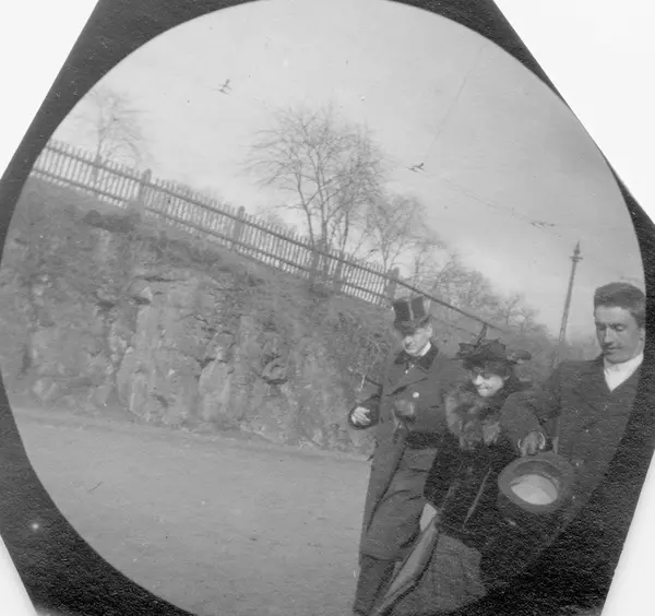 To menn og en kvinne spaserer foran skrent med gjerde på toppen, ant. Oslo.