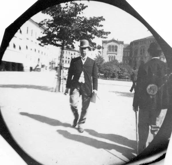 Apoteker G. L. Størmer, fotografens far, spaserer langs Karl Johans gate, Oslo, med Stortinget i bakgrunnen.