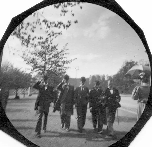 Gruppe med studenter spaserer i Studenterlunden, Oslo, med ryggen til Slottet. Fra venstre: Hesselberg, Koren, Steffens, ?, Moestue.