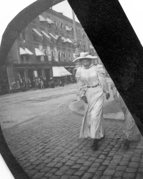 Frk. Ada Lund, senere fru Arnfinsen, Trondheim, spaserer i bygate, butikker på andre siden. Ant. Karl Johans gate, Oslo.