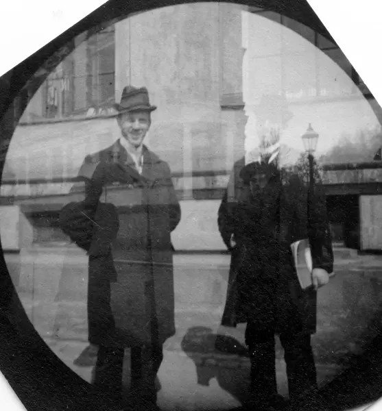 Herman Reimers og en annen mann står foran bygård, ant. Oslo.