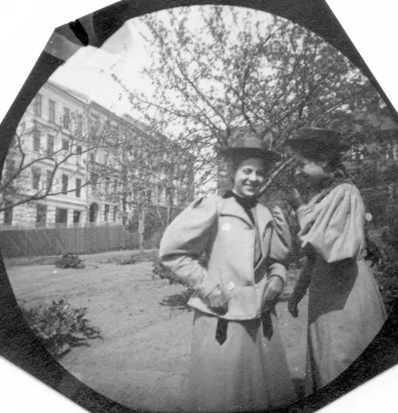 Lucy Reimers og frk. Nilsen i hage i Vestheimgaten 1, Oslo.
