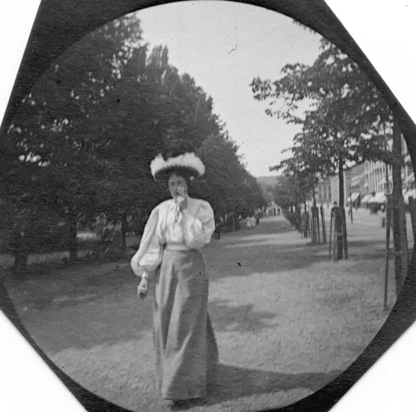 Frk. Heyerdahl, senere fru Lund, spaserer langs Karl Johans gate, Oslo.