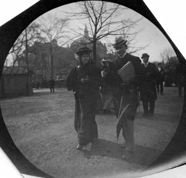 Frk.Baby Kielland, senere fru W. Krag, og stud. med. Niels Heitmann spaserer langs Karl Johans gate, Oslo. med Nationaltheatret bak.