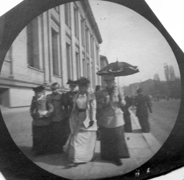 Frk. Maren Astrup, frk. Solveig Berg og frk. Ellen Wille spaserer langs Universitetet, Karl Johans gate, Oslo.