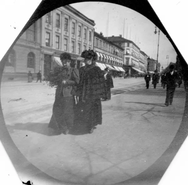 Frk. Aagot Lund, senere fru Schnitler, og søster fru Skabo spaserer langs Karl Johans gate, Oslo.