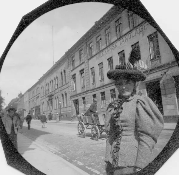 Frk. Magnella Arents (Arentz?)står i bygate, ant. Oslo, med hestekjøretøy i gata. Tannlegeskilt på en husvegg.