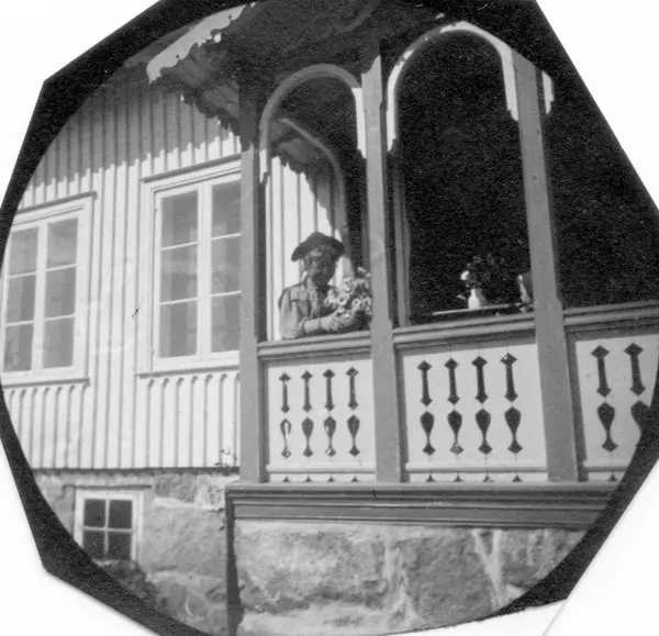 Frk. Maren Astrup på veranda i Ula, Tjølling, Larvik, Vestfold. Sveitserstil.