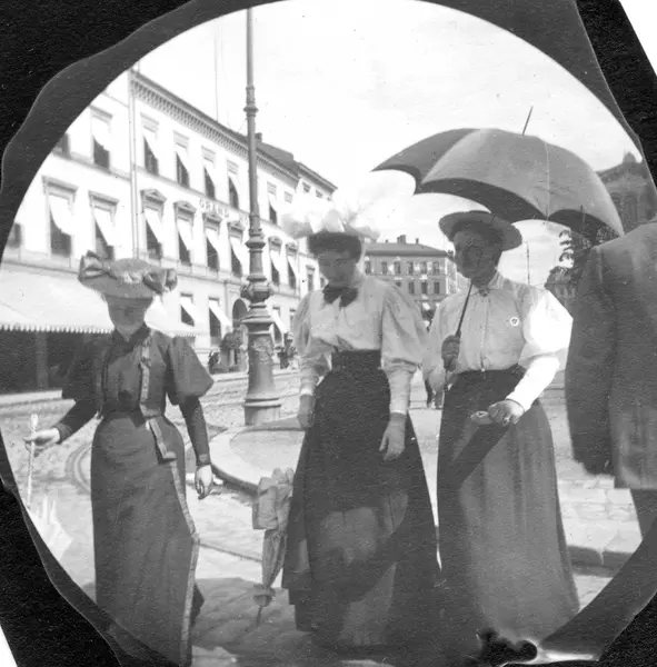 Frk. Dahr, frk. L*Orange og frk. Selma Faye, senere fru Zimmer, spaserer langs Karl Johans gate, Oslo, med Grand Hotel på den andre siden.