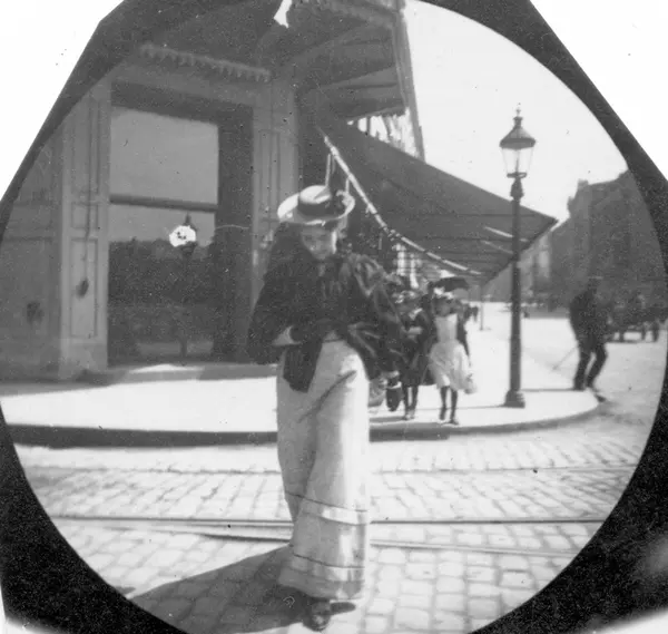 Frk. Greve, senere fru Collin, krysser gata ved Grand kafe, Karl Johans gate, Oslo,