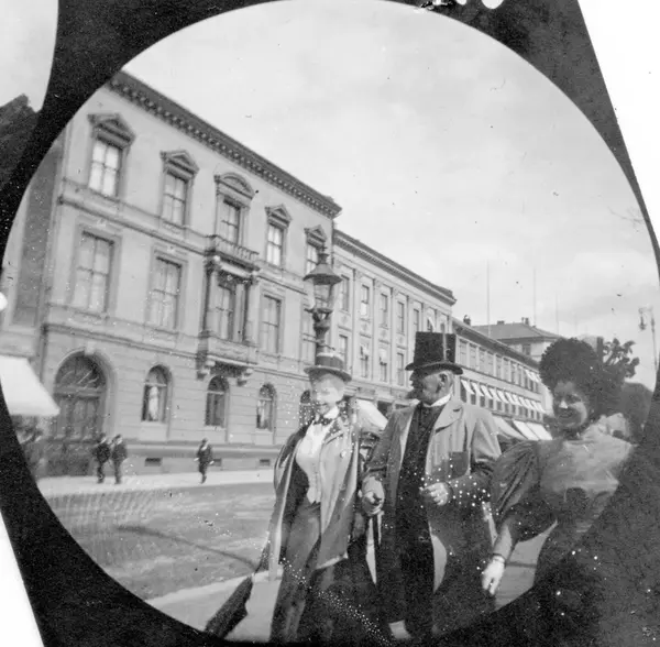 Frk. Ricke Sverdrup, dr. Thaulow og fru Mowinckel spaserer langs Karl Johans gate, Oslo.