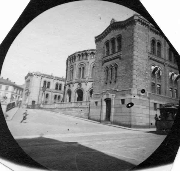 Skarpsnotrikken forbi Stortinget i Oslo i perioden 1894 - 1898.
