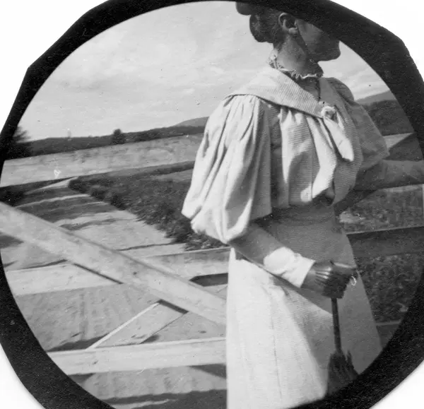 Frk. Solveig Berg ved grind over vei.
