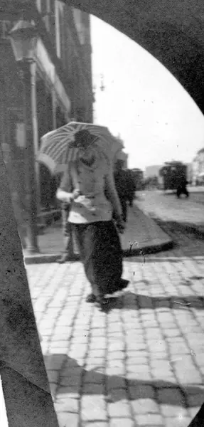 Kvinne med parasoll i bygate, ant. Oslo. Bygårder bak.