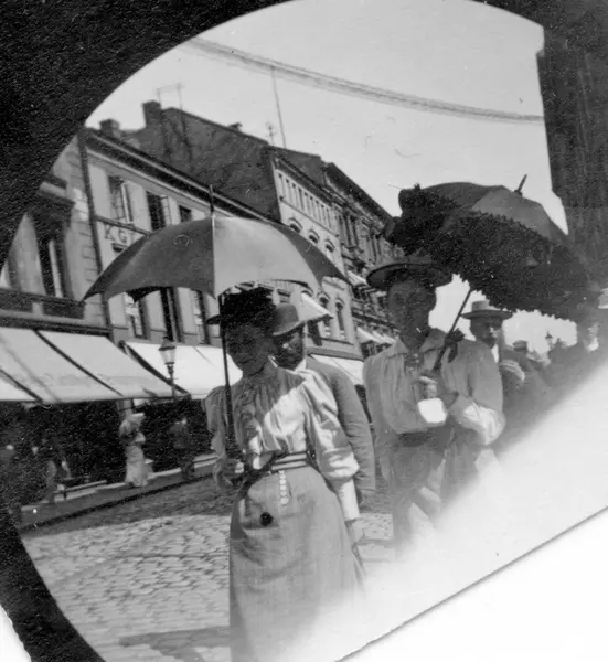 To kvinner med parasoll i bygate, Karl Johans gate, Oslo. Bygårder og butikker bak.