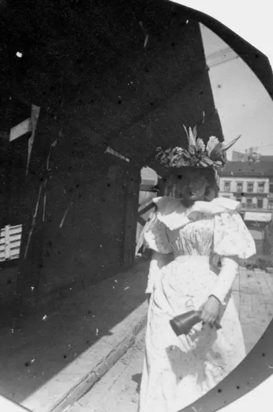 Hvitkledd kvinne spaserer langs en slags verkstedsbygning, ant. Oslo, Bygårder i bakgrunnen.