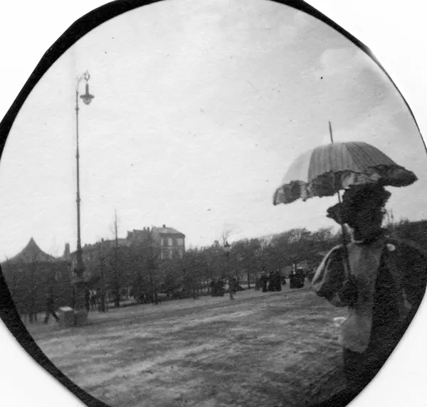 Kvinne med parasoll spaserer i park, Oslo. Bygårder i bakgrunnen.