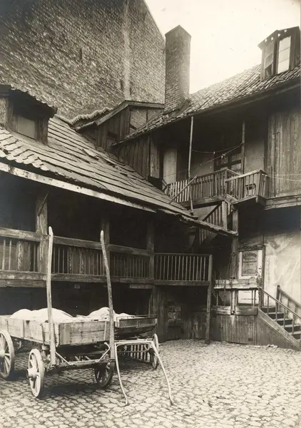 Brogata 6, Oslo. Bakgård med byggninger, brostein og kjerrer.