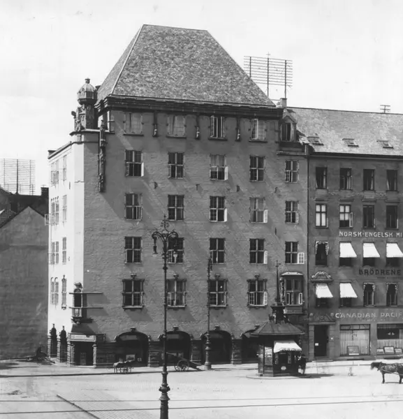 Karl Johans gate 1, Oslo. Bygård tegnet av arkitekt Magnus Paulsen med kiosk i forgrunnen.