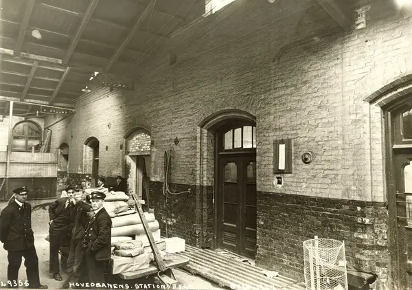 Jernbanepersonale med godstralle fra Østbanen, Jernbanetorget 1, Oslo. 1924.