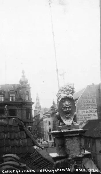 Colletgården, Kirkegata 15, Oslo. Statue av løve på taket. Nå på Norsk Folkemuseum.