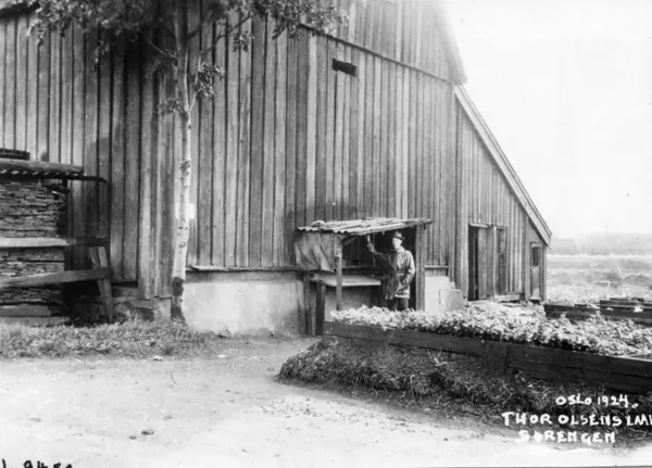 Sørenga, Oslo 1924. Mann foran Thor Olsens låve. Kortveggen.